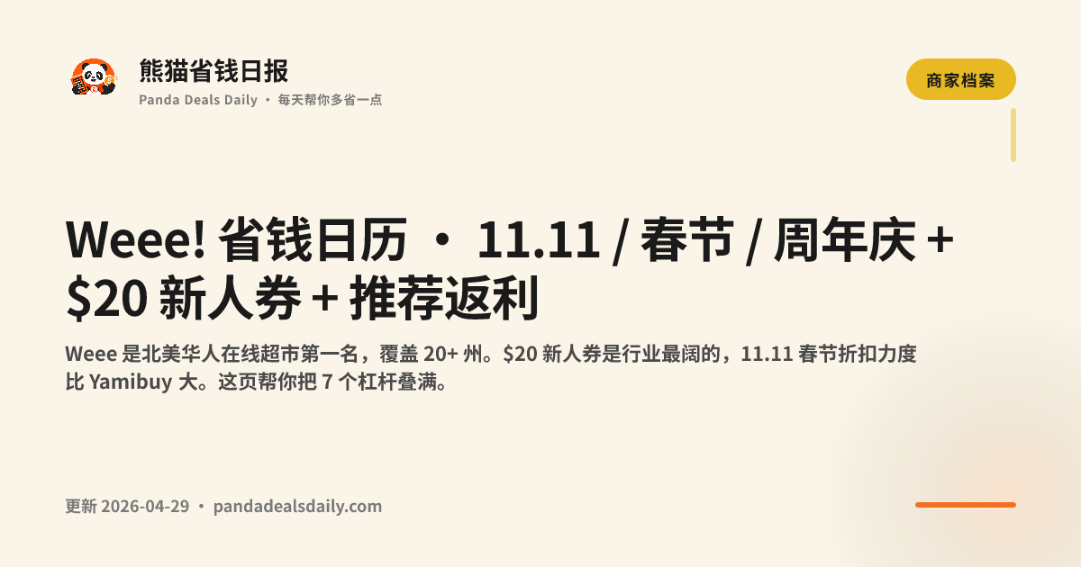 - 具体 11.11 / 双十二 起止日期 — Weee 不提前官宣,得当年活动页 check